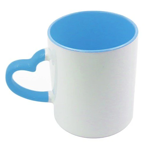 Cană ceramică albă cu mâner albastru, perfectă pentru realizarea de cadouri personalizate sau produse promoționale pentru companii. Exteriorul alb oferă o suprafață ideală pentru aplicarea imaginilor, textelor sau logo-urilor, iar interiorul colorat adaugă un aspect modern și elegant.
